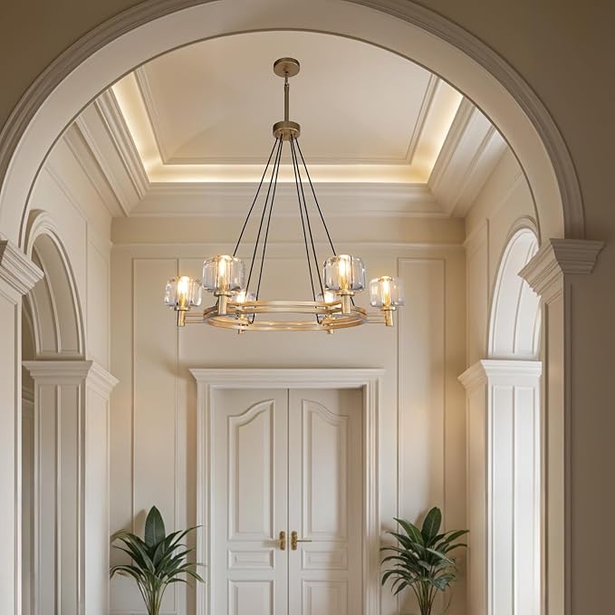 - 【WIDELY USE】This gold crystal chandelier is ideally suited for a diverse range of settings such as living room, bedroom, dining area, kitchen, entryway, hallway, office. And beyond with this farmhouse chandelier to elevate your interior decor.