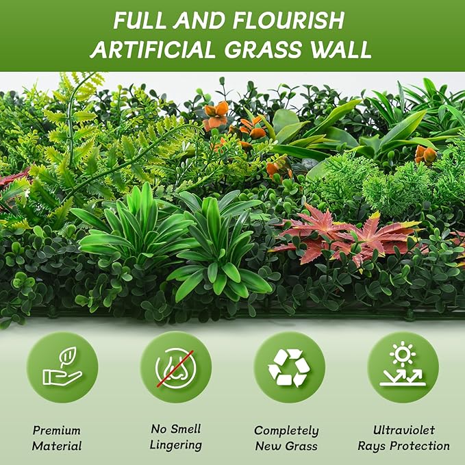- 【Vivid & Realistic Grass Wall Panels】 Crafted with horticultural expertise, our upgraded Grass Wall Panels use 7 kinds of flowers and plants with different characteristics to create a more vivid, dynamic and rich decorative wall that is closer to nature. UV-resistant coloring ensures fade-proof lushness year-round, preserving springtime vibrancy on walls indefinitely.