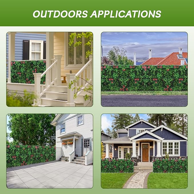 - 【UV Protection & Enhanced Privacy】The artificial boxwood panels provides authentic and dense privacy shield hedge panels whose leaves have been upgraded to 4 layers and 2 layers high for a more lush appearance without any visible gaps. Anti-uv and anti-oxidant additives are included in artificial hedges for outdoor and indoor use, ensuring its long-term durability to protect privacy and aesthetics.