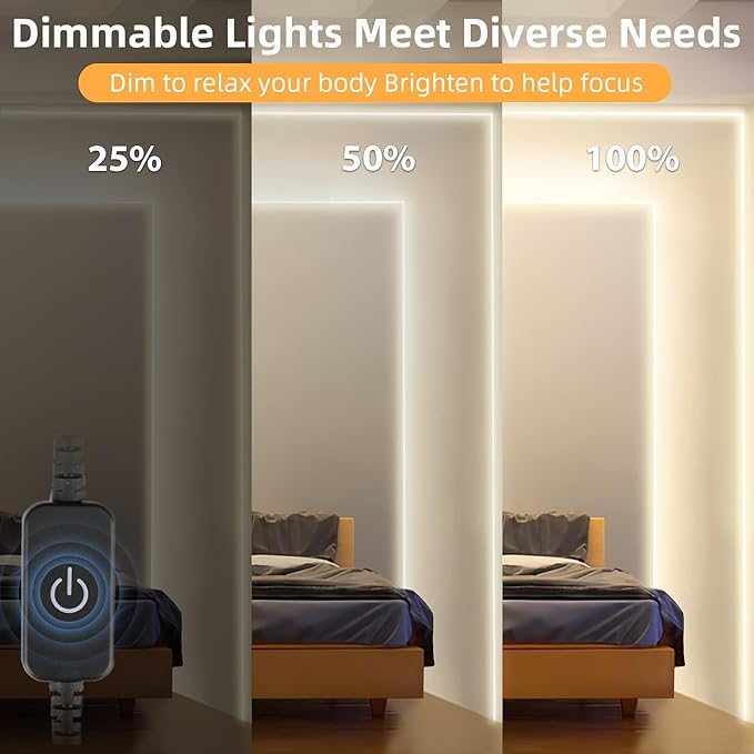 - 【Touchable Dimmable Controller】- Unique design LED light strip come with an upgraded Touchable Dimmable Controller, long-press dimmer to adjust light brightness (dim to bright), and short press to turn on/off. You could adjust the 10%-100% Level of Brightness as you like, No more Harassing Remote Resetting Steps Keeping it Used for a Long time