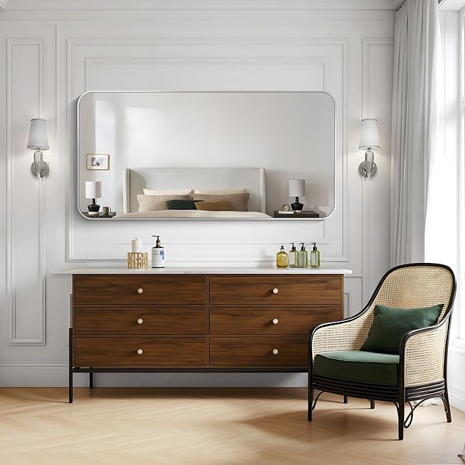 KOCUUY Silver Bathroom Mirror, 60x30 Inch Large Bathroom Mirror for Over Sink, HD Tempered Glass, Anti-Rust Brushed Silver Frame, Rounded Corner Modern Design for Bathroom, Hang Horizontal/Vertical