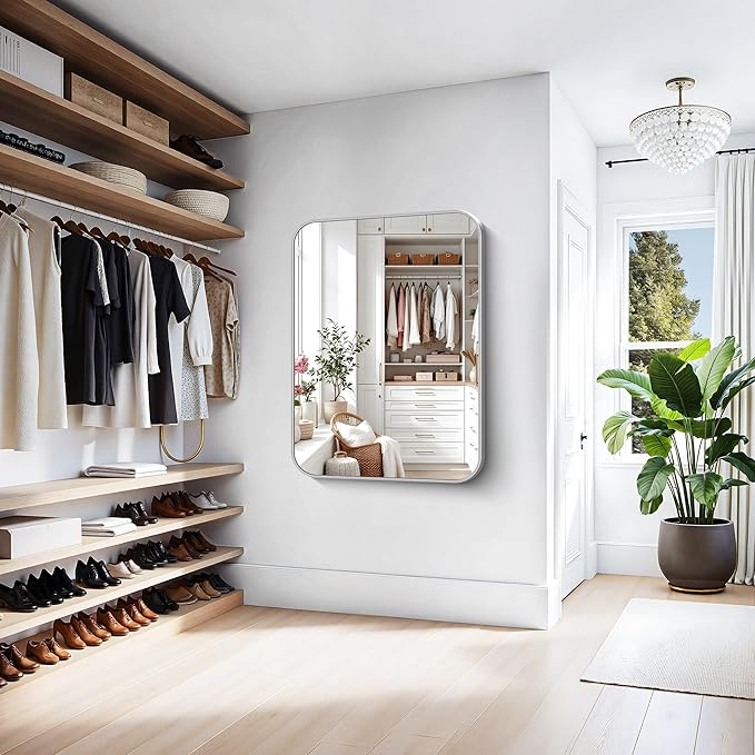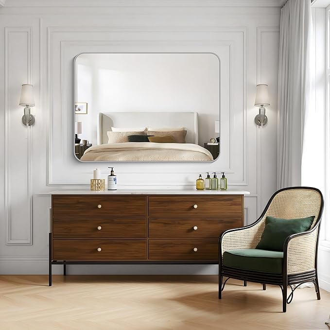 KOCUUY Silver Bathroom Mirror, 48x36 Inch Large Bathroom Mirror for Over Sink, HD Tempered Glass, Anti-Rust Brushed Silver Frame, Rounded Corner Modern Design for Bathroom, Hang Horizontal/Vertical
