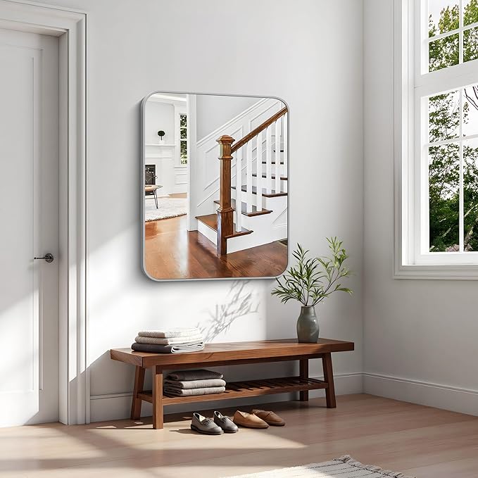 KOCUUY Silver Bathroom Mirror, 30x36 Inch Bathroom Mirror for Over Sink, HD Tempered Glass, Anti-Rust Brushed Silver Frame, Rounded Corner Modern Design for Bathroom, Hang Horizontal/Vertical