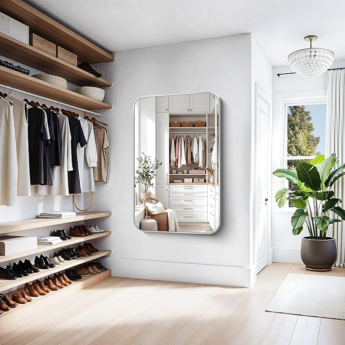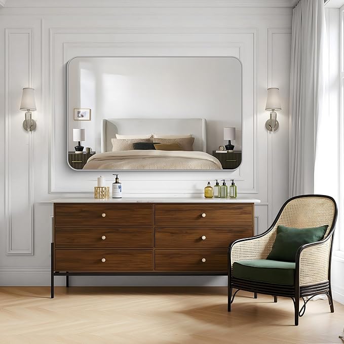 KOCUUY Silver Bathroom Mirror, 55x36 Inch Large Bathroom Mirror for Over Sink, HD Tempered Glass, Anti-Rust Brushed Silver Frame, Rounded Corner Modern Design for Bathroom, Hang Horizontal/Vertical
