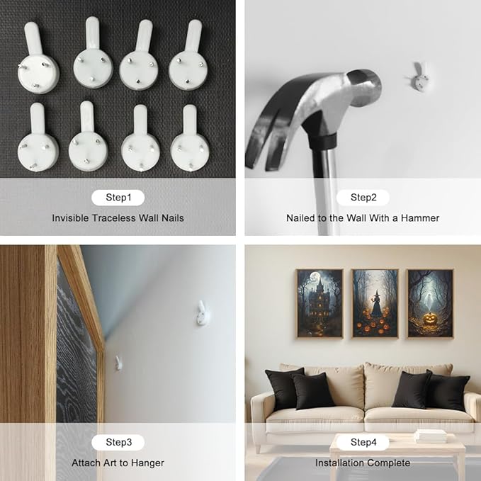 - [Halloween Moon Castle Framed Wall Art Set] This halloween castle and witch framed canvas wall art set captures pumpkin and ghost evoking an mysterious atmosphere. Its modern Shadowy aesthetic is reminiscent of Vintage halloween charm. Utilizing this artwork as part of your decor will make your room full of scary atmosphere.