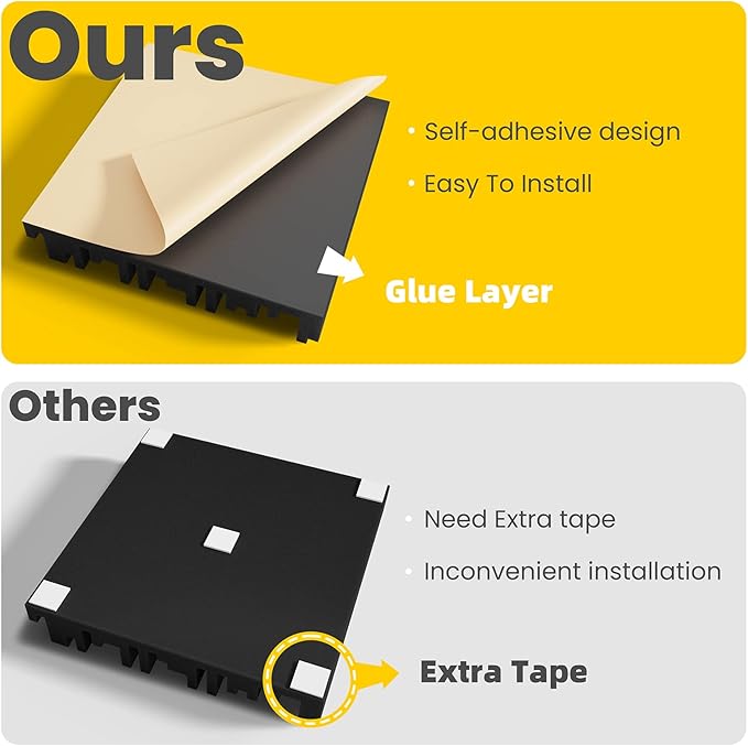 - Easy Peel & Stick Installation - Our soundproof foam panels come with pre-applied double-sided tape, making installation quick and hassle-free. Simply peel off the protective layer and stick the panels to any smooth surface—no additional tools or adhesives required. Perfect for DIY enthusiasts and professionals alike