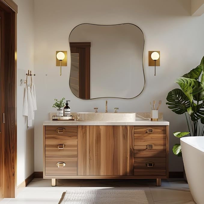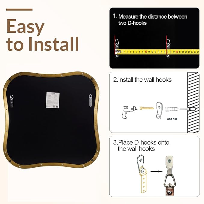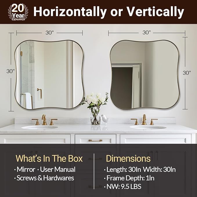 - Easy-Hang & Safe Delivery: This unique 30x30 inch wavy bathroom mirror features triple-layer protection—PE bag, poly foam, and sturdy master box—to ensure secure delivery. The modern brass vanity mirror includes four reinforced D-ring hanging clips, enabling straightforward horizontal or vertical installation with included hardware