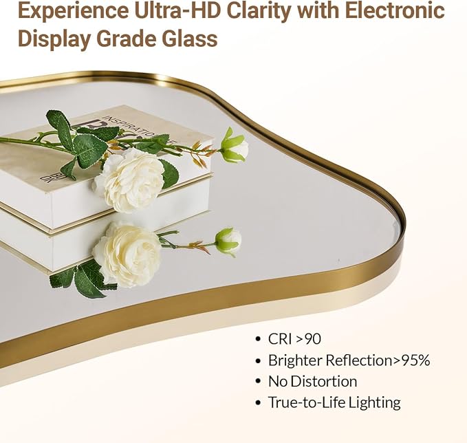 - ANDY STAR Belief: With 20 years production experience, we are confident of every brass irregular bathroom mirror you received is fully quality-assured. Replacement is GUARANTEED if any damaged or defective including distorted when you receive it. Just contact us freely through amazon, we would make it right accordingly.