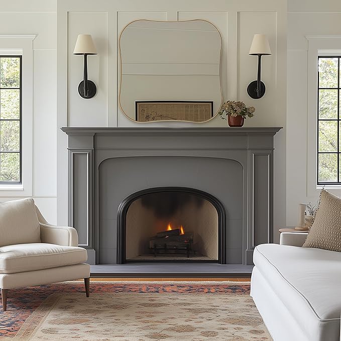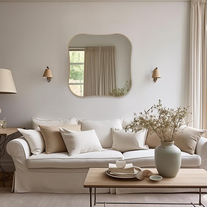 - Sleek Aesthetic Design: This square 30x30 mirror is meticulously crafted with a brushed gold finish on a stainless steel metal frame, featuring softly curved edges that make it stand out from others. The curved edge design of this scalloped wall mirror creates a sophisticated balance with light fixtures, infusing your space with a sense of softness. It elevates any décor style and adds a unique touch to your space.
