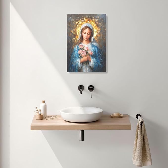 Christian Mary Wall Art Mary Mother Of God Canvas Wall Decor Catholic Blessed Mother with Roses Pictures Christ Paintings Prints Religious Bible Artwork Framed Decorations For Church Prayer Room Chapel Bathroom Bedroom Living Room Gifts 16" x 24"