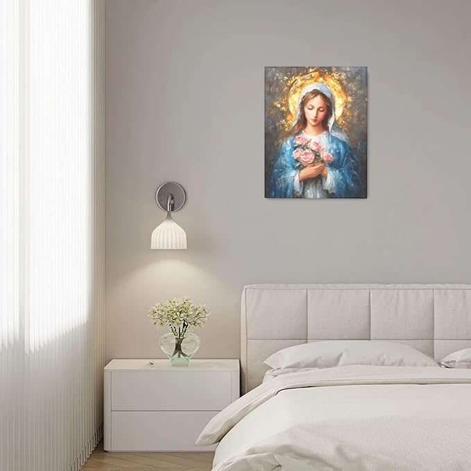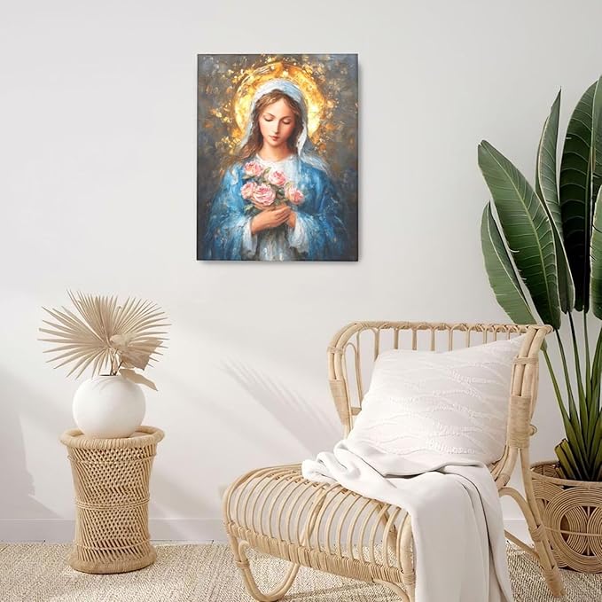Christian Mary Wall Art Mary Mother Of God Canvas Wall Decor Catholic Blessed Mother with Roses Pictures Christ Paintings Prints Religious Bible Artwork Framed Decorations For Church Prayer Room Chapel Bathroom Bedroom Living Room Gifts 16" x 20"
