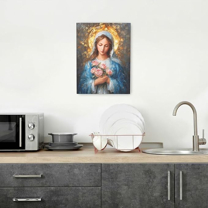 Christian Mary Wall Art Mary Mother Of God Canvas Wall Decor Catholic Blessed Mother with Roses Pictures Christ Paintings Prints Religious Bible Artwork Framed Decorations For Church Prayer Room Chapel Bathroom Bedroom Living Room Gifts 12" x 16"