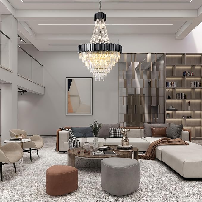 - 【Luxury High Ceiling Chandelier】This stunning modern chandelier features 420 sparkling K9 crystals set in a durable black metal frame with a high-polished electroplated finish. Built to last with rust- and corrosion-resistant materials, it combines elegance with strength. The tiered crystal design creates a dazzling light effect, with each crystal perfectly reflecting and refracting light to fill your home with a modern, glamorous, and luxurious ambiance.