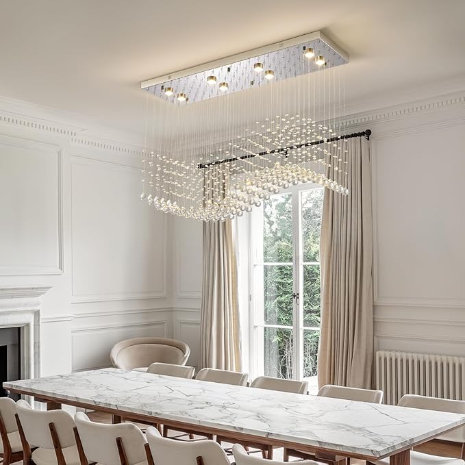 - [Premium Craftsmanship & Durability]: Designed for lasting brilliance, our exquisite long chrome chandelier lights for ceiling feature hand-strung K9 crystals and a sturdy rectangular stainless steel frame. Each crystal of our contemporary modern staircase rectangle chandeliers for dining room light fixture is polished to optical clarity, ensuring optimal light transmission—radiating a soft yet luminous glow that enhances any space with timeless elegance.