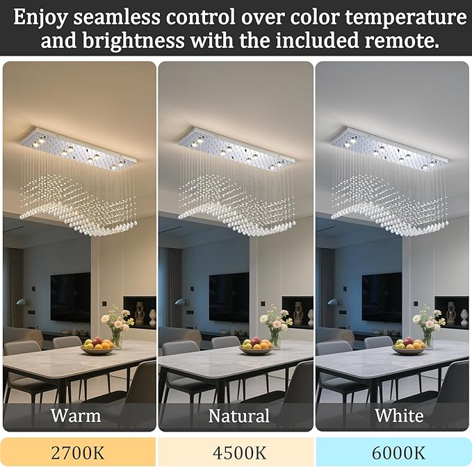 - [Customizable Color & Brightness]: Tone Control: The rectangular flush mount ceiling light instantly switches between warm white (3000K) and cool daylight (6500K) using the wall switch. Dimmer Control: The modern silver chandelier ceiling lights adjust brightness levels seamlessly via the included remote. (Requires remote – not compatible with standard dimmer switches)