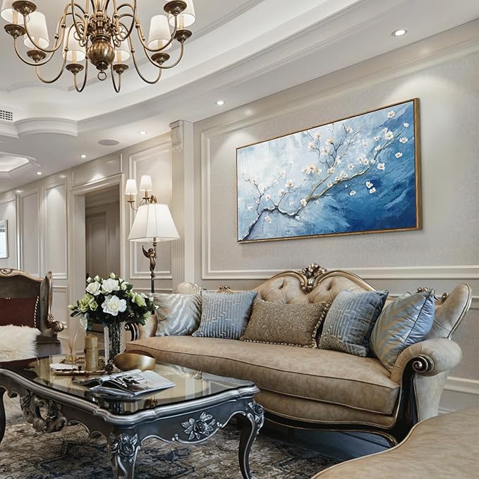- ★Nature-Inspired Serenity Canvas Art: Featuring graceful white plum blossoms drifting across a textured gradient of sky and ocean blues, this large canvas art print captures the quiet elegance of nature. The minimalist branches and soft petals evoke peace and renewal—perfect for creating a calming atmosphere.