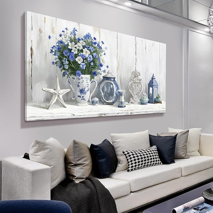 Nicetop Oversized Vintage Wall Art – Rustic Coastal Still Life Floral Canvas Print Country Farmhouse Cottagecore Shabby Chic Style Botanical Artwork Blue Picture for Large Living Room Kitchen 58x29Inch