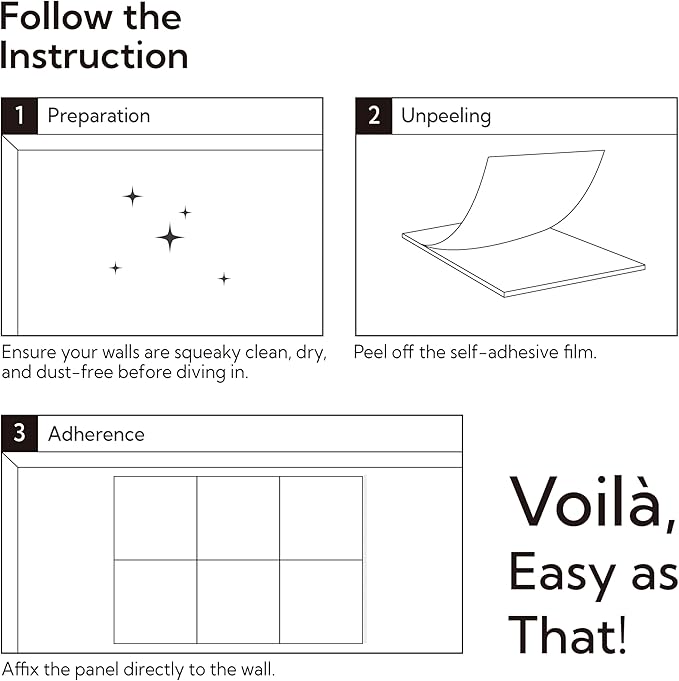 - Easy Peel and Stick Setup, No Tools Required: Each self adhesive wall panel includes strong adhesive backing, so these sound panels are used for quick DIY installation. Just peel, stick, and arrange to cover walls, doors, or ceilings,fully customizable. These acoustic wall panels are Ideal for subtle, natural decor while maintaining a clean, contemporary look.
