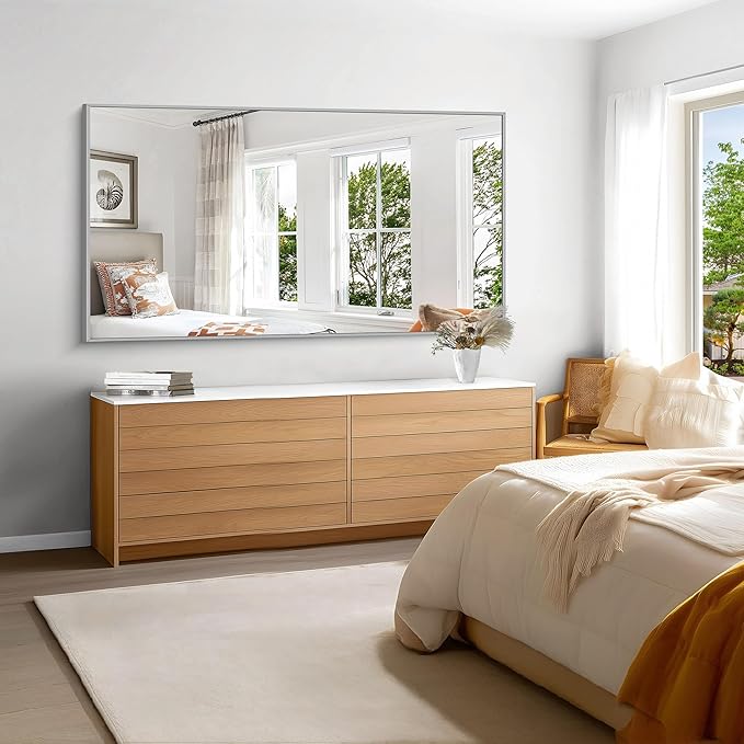 - MODERN DESIGN : KOCUUY 60x30 silver vanity mirror is with innovative design which gives the wall mirror a more fashion feel. With a classic square corner, the wall mounted mirror allows for creativity and functionality in bathroom, bedroom, entryway and anywhere else. Let your living space be an expression of your personal style, not limited to modern or contemporary, farmhouse or industrial