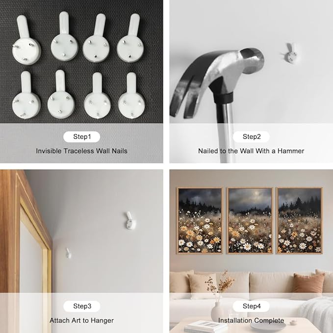 - 【Moody and Calming Wall Art】The size of the framed canvas wall art set is: 24x36 inchx3pcs (60x90cmx3pcs).This triptych depicts a dreamy natural scene. The foreground has a meadow with colorful daisies. Mist lingers in the middle ground. The background shows a dark forest under a moody sky, with a pale moon shining through clouds, creating a tranquil yet mysterious vibe.