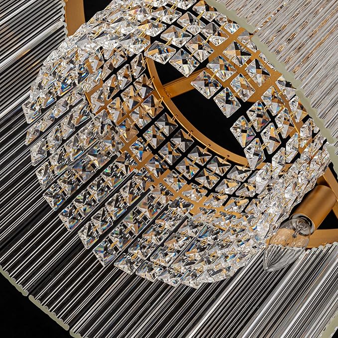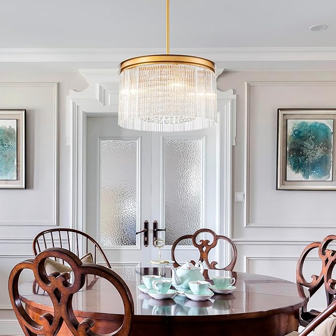 - Gorgeous Appearance: This crystal chandelier is a standout crystal chandelier (and k9 crystal-adorned piece) with a durable warm brass frame—embodying a gold chandelier light fixture and gold vintage crystal chandelier. Cascading from it are shimmering K9 crystal pendants, paired with a ripple glass light-style shade (also a drum glass shade) that adds texture. It’s a glass drum chandelier blending metal, crystal, and glass, suiting grand dining rooms (as chandeliers for dining room), chic living spaces, or upscale lobbies, infusing radiant luxury.