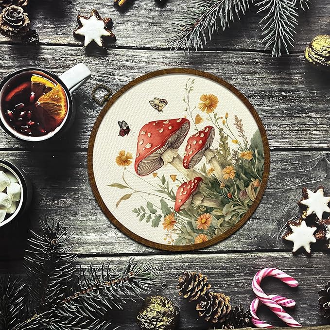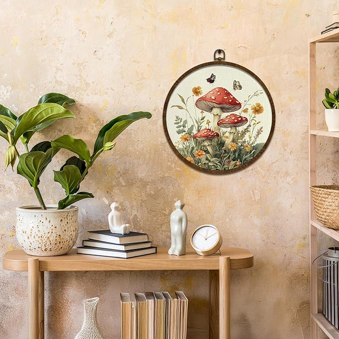 KLYTINK Vintage Fantasy Mushroom Floral Wall Art, Round Canvas Wall Hanging Decor, Fantasy Forest Botanical Illustration, for Living Room,Bedroom,office 10x10 Inch(MG09)