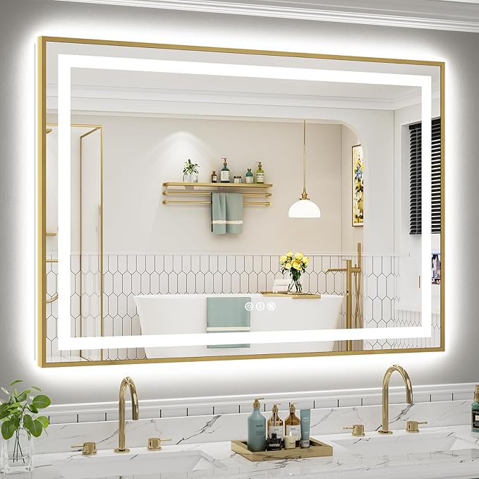 55x40 Inch LED Bathroom Mirror with Gold Frame, Backlit & Front Lit, Anti-Fog Lighted Bathroom Vanity Mirror for Wall, Memory Function, Dimmable, HD Tempered Glass, Shatter-Proof