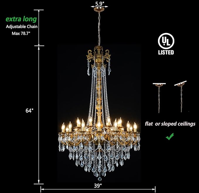 - Extra Large Chandelier for 18–24 ft Ceilings: UL Listed. Measures 39" diameter × 64" height with a 78.7" adjustable chain (overall 68"–142"). Perfect for high, vaulted, sloped, or flat ceilings. Canopy: 5.9". Material: Top clear K9 crystals and metal. Color: Antique Bronze Gold.