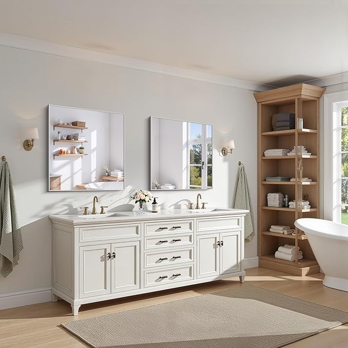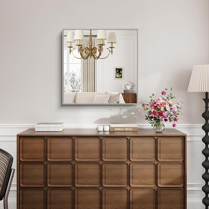 - MODERN DESIGN : KOCUUY 30x30 silver vanity mirror is with innovative design which gives the wall mirror a more fashion feel. With a classic square corner, the wall mounted mirror allows for creativity and functionality in bathroom, bedroom, entryway and anywhere else. Let your living space be an expression of your personal style, not limited to modern or contemporary, farmhouse or industrial