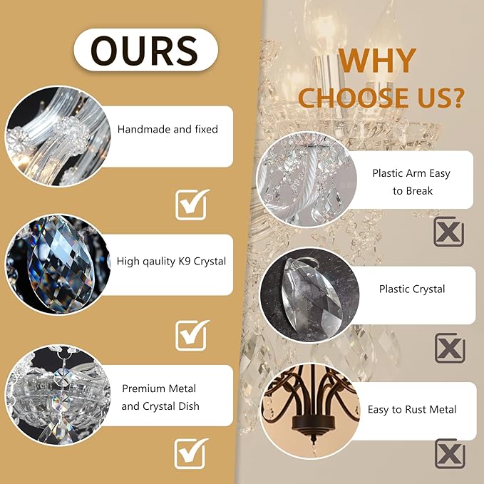 - 【Dazzling Focal Point & Premium Craftsmanship】 Command attention in your grand living room or dining space! This stunning chandelier features high-clarity crystals that sparkle brilliantly, transforming it into a breathtaking centerpiece. Expertly crafted with durable metal frames and premium K9 crystal for lasting elegance.