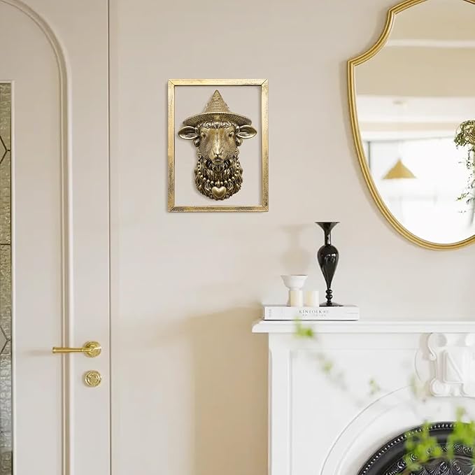 Animal Heads Wall Decor (Includes Metal Frame) Resin Animals Sculptures Head Wall Hanging Decoration Gold vintage Wall Sculpture for Living Room Bedroom Office(Sheep)