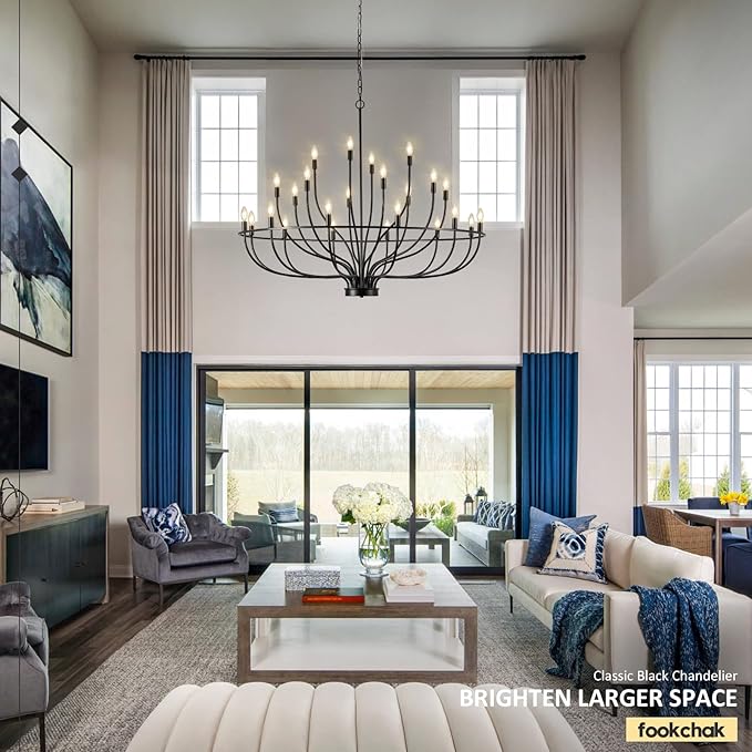 - 51 inch 24 Light Chandelier - FookChak large black chandelier is a perfect fusion of timeless classics and modern style. Composed of 24 minimalist black candle sockets, it adds a touch of sophistication to homes like a low-profile bouquet chandelier. Its classic shape exudes modern classic charm. This 24 light black chandelier light fixture offers exceptional brightness and a wide range of illumination for large living rooms, high ceiling foyers, entryway, master bedroom.