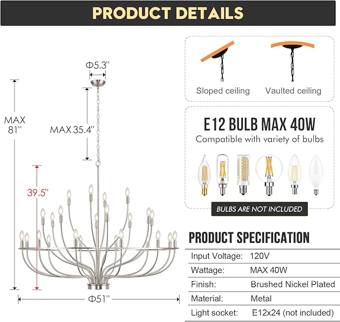 - E12 Socket Max 40W-This modern classic chandelier is 51in wide and has 24 X E12 base bulbs, each with a maximum wattage of 40W. With 24 sockets, it provides wider and brighter illumination, creating an exquisite and inviting atmosphere. BUBL NOT INCLUDED. If you would like the light to be dimmable, please purchase E12 dimmable bulbs and a compatible wall switch.