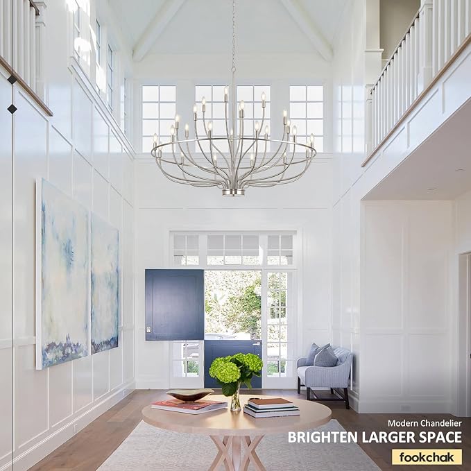 - 51 inch 24 Light Chandelier - FookChak large nickel chandelier is a perfect fusion of timeless classics and modern style. Composed of 24 minimalist brushed nickel candle sockets, it adds a touch of sophistication to homes like a low-profile bouquet chandelier. Its classic shape exudes modern classic charm. This 24 light nickel chandelier light fixture offers exceptional brightness and a wide range of illumination for large living rooms, high ceiling foyers, entryway, master bedroom.