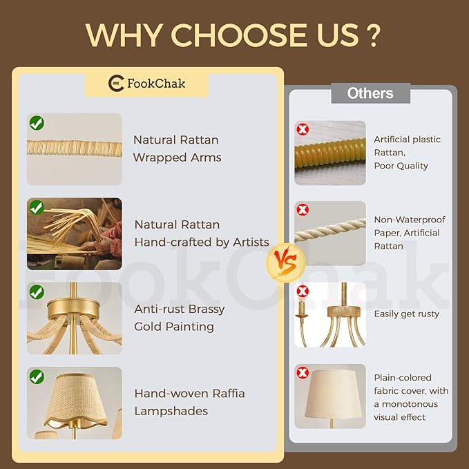 - 【Durable Anti-rust Light Frame】FookChak 6 light gold chandelier light fixture features a sturdy anti-rust metal frame. Finished with anti-rust brass gold painting, it offers a lustrous, fade-resistant surface that perfectly combines beauty and durability. FookChak bohemian rattan chandelier brings a natural charm and warm lighting to your space, while ensuring reliable, long-lasting performance.
