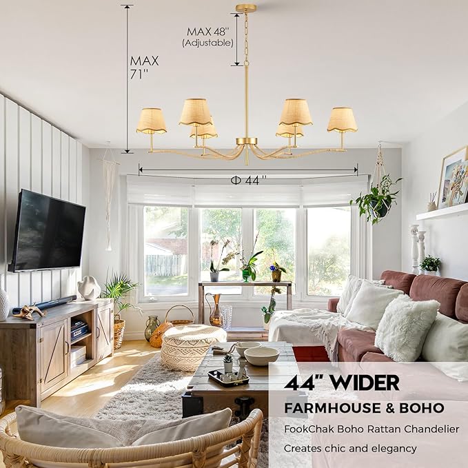 - 【48in Adjustable Chain 】FookChak 44in wide rattan chandelier with 48in adjustable chain, offers flexibility in installation. It could be a flexible entry chandelier ceiling light or a dining room chandelier over table. Capable of use on flat and sloped ceilings. Includes accessories and detailed instructions, and is quick and easy to install.