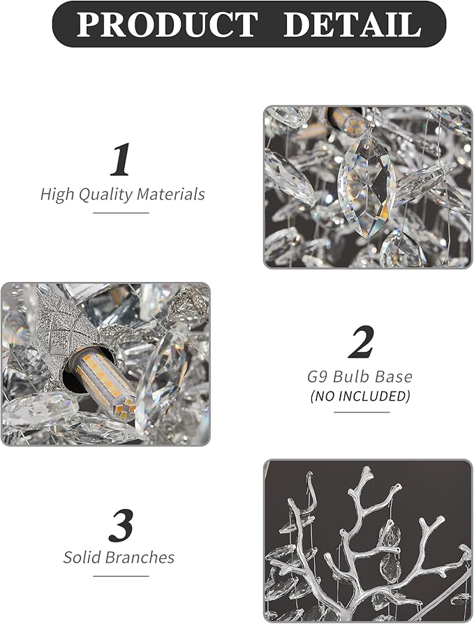 - Modern Tree Branch Crystal Chandelier: The surface of the chandelier is completed by metal painting process, corrosion resistance, rust prevention, and easy installation. The chrome stems are thickened and encrypted, and the branches can be adjusted manually. Sparkling crystals are strung across the branches of this light fixture. Crystal Tree branch chandelier lighting is perfect for luxury and it helps to create a luxurious and vibrant atmosphere in the room