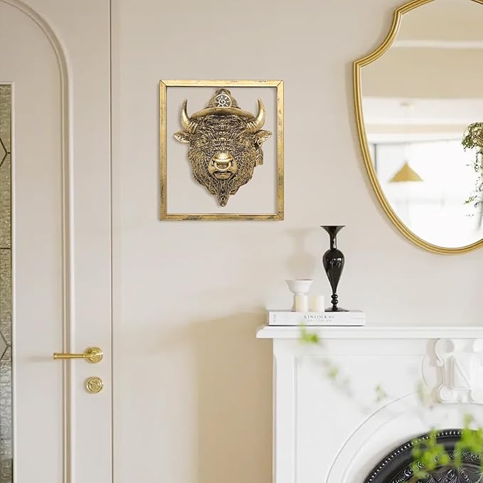 - Trendy Design:The bison is wearing a cowboy hat on its head and feathered earrings dangling from its ears,brings a hip, artistic vibe to the walls of any room