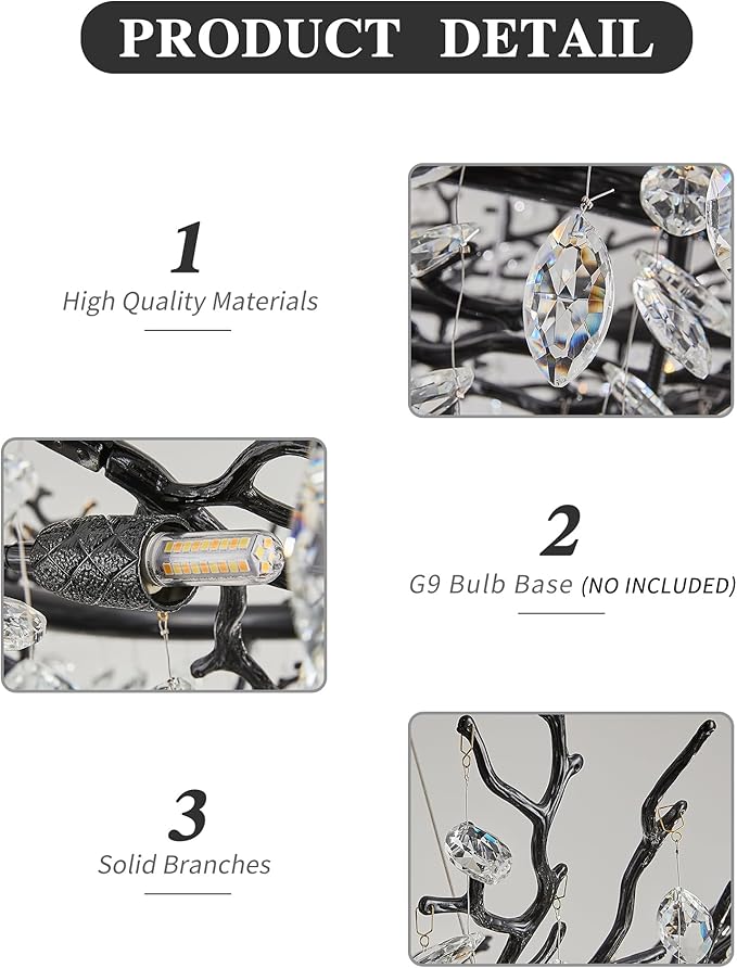 - Modern Tree Branch Crystal Chandelier: The surface of the chandelier is completed by metal painting process, corrosion resistance, rust prevention, and easy installation. The black stems are thickened and encrypted, and the branches can be adjusted manually. Sparkling crystals are strung across the branches of this light fixture. Crystal Tree branch chandelier lighting is perfect for luxury and it helps to create a luxurious and vibrant atmosphere in the room