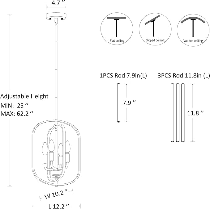 - [Adjustable Height] Length: 12.2 in, Height: 10.2 in, Height: 25~62.2 in, Canopy Diameter: 4.7 in. Flat,sloped and vaulted ceilingsare compatible. The black geometric chandelier is designed with splicing rod, which provides stability and reduces any shaking compared to the chain type. Comes with one 7.9" and three 11.8" rods, so you can flexibly adjust the hanging height of the farmhouse dining room light fixtures over table.