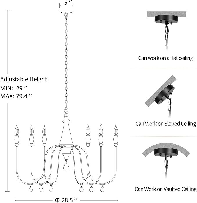 - [Adjustable Height] - Diameter: 28.5 in, Height: 29~79.4 in, Canopy Diameter: 5 in. Antique chandelier comes with a 47-inch long adjustable chains and the height of the rustic chandelier can be easily adjusted to your liking. And, the unique chandelier is allowed to be installed on sloped or flat ceilings.