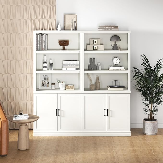 - Versatile Home Design: This attractive and practical bookcase with doors features three open upper shelves with two adjustable boards, making it easy to display decorative items, books, figurines, etc., keeping your favorite things in plain sight. The bottom cabinet with double doors includes one adjustable shelf, allowing you to divide the storage space as needed, hide infrequently used items, prevent dust, and keep your home tidy.
