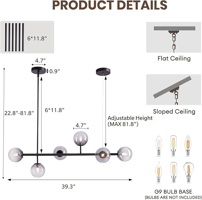 - 【Perfect Dimensions for Any Space】Black modern chandelier with 6 adjustable 11.8” rods, allowing the height to reach up to 81.9”. It features G9 sockets with 4.7” glass globes. Compatible with 120V and dimmable when used with the appropriate bulbs and switch. (Warning: Bulbs and dimmer switch are not included.)
