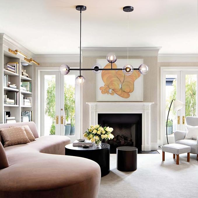 - 【Mid Century Modern Globe Chandelier – Sleek and Stylish Design】This mid century modern chandelier features sleek, smoky glass globes that diffuse a warm, inviting glow. With its bold black frame, it adds a stylish accent and ample light to any kitchen island or dining space.
