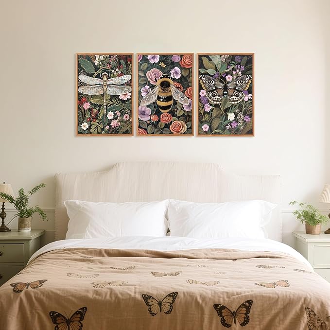 Aurlan Moody Boho Flowers Insect Framed Wall Art(16"x24"), 3PCS Dark Academia Cottage Core Whimsical Bee Butterfly Dragonfly Canvas Artwork, Abstract Vintage Floral Botanical Plant Decor for Home Office Bedroom