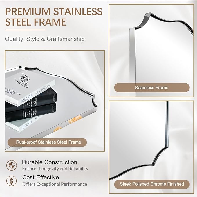- 【Rust-Proof Stainless Steel Frame】: (N.W:24LBS). Crafted from stainless steel with oxidation-resistant properties, this chrome bathroom mirror offers enhanced stability and a longer lifespan. Shatterproof 4mm HD glass is supported by a 9mm MDF backboard (most others just 3mm ), surrounded by a 1/17" gap with unique curved corner design to give a seamless finish