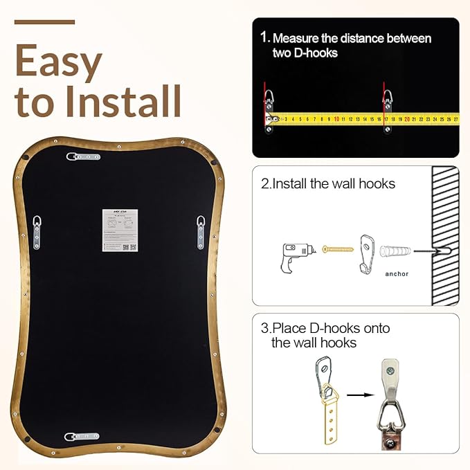 - Easy-Hang & Safe Delivery: This unique curved bathroom mirror features triple-layer protection—PE bag, poly foam, and sturdy master box—to ensure secure delivery. The contemporary brass vanity mirror includes four reinforced D-ring hanging clips, enabling straightforward horizontal or vertical installation with included hardware