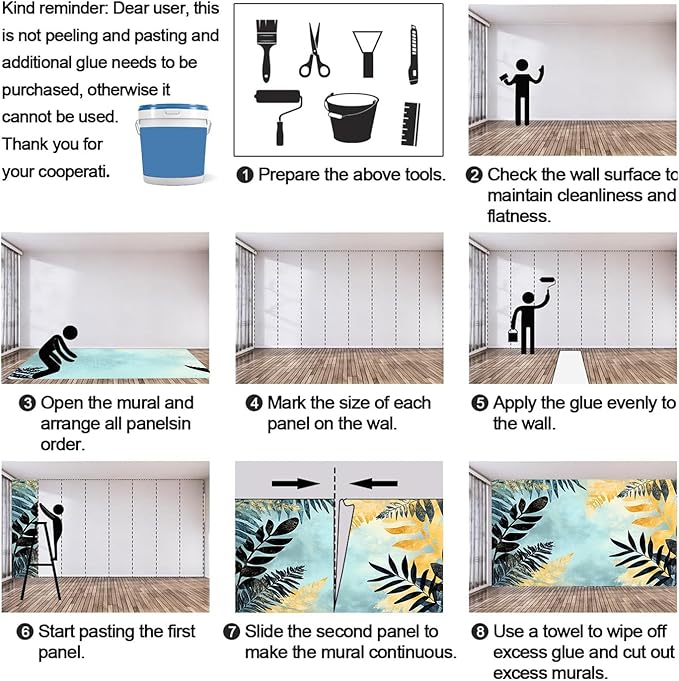 - DIY Murals: Wallpaper is not pre-pasted (need to be purchased by yourself), before installing the mural, please make sure the wall is flat, clean, dry and dust-free. Apply thick wall glue on the wall, slide the wallpaper into place to match the pattern