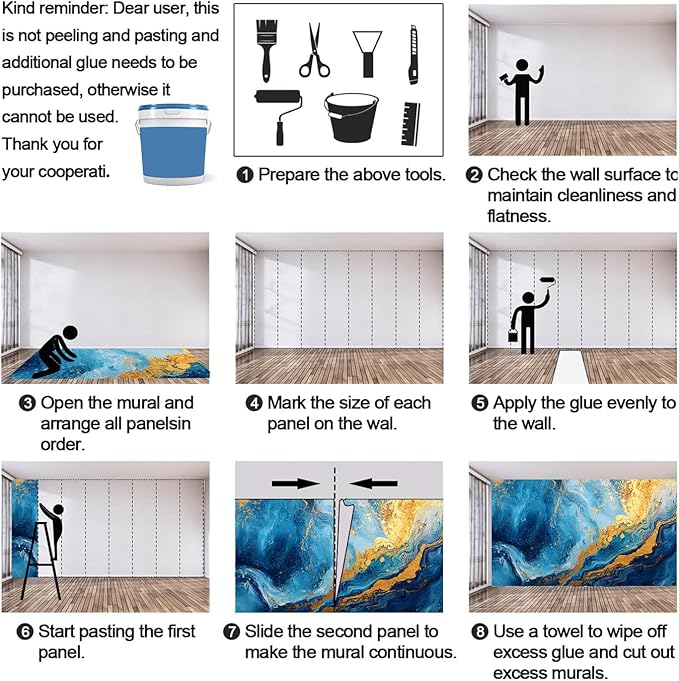- DIY Murals: Wallpaper is not pre-pasted (need to be purchased by yourself), before installing the mural, please make sure the wall is flat, clean, dry and dust-free. Apply thick wall glue on the wall, slide the wallpaper into place to match the pattern