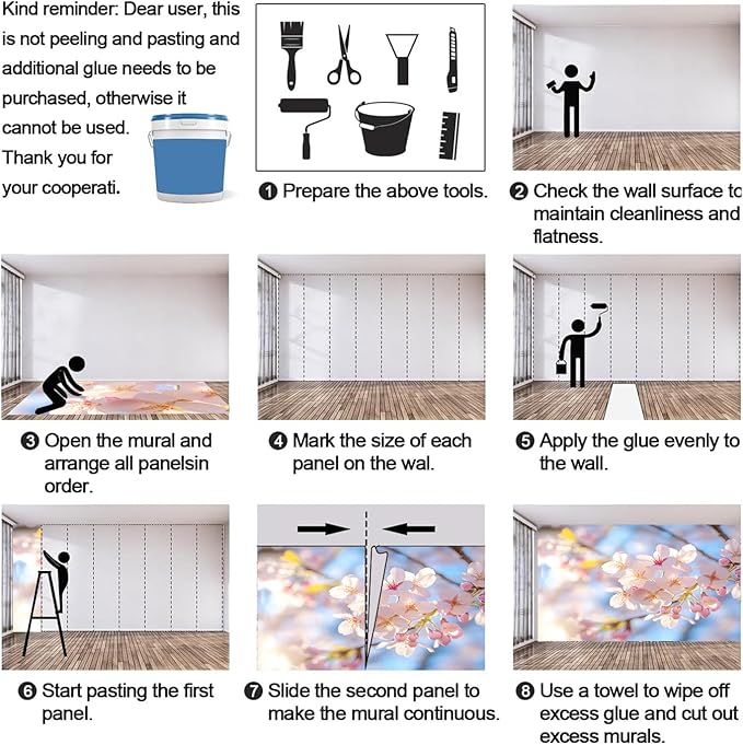 - DIY Murals: Wallpaper is not pre-pasted (need to be purchased by yourself), before installing the mural, please make sure the wall is flat, clean, dry and dust-free. Apply thick wall glue on the wall, slide the wallpaper into place to match the pattern